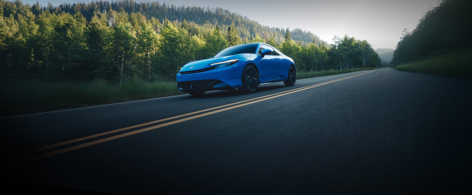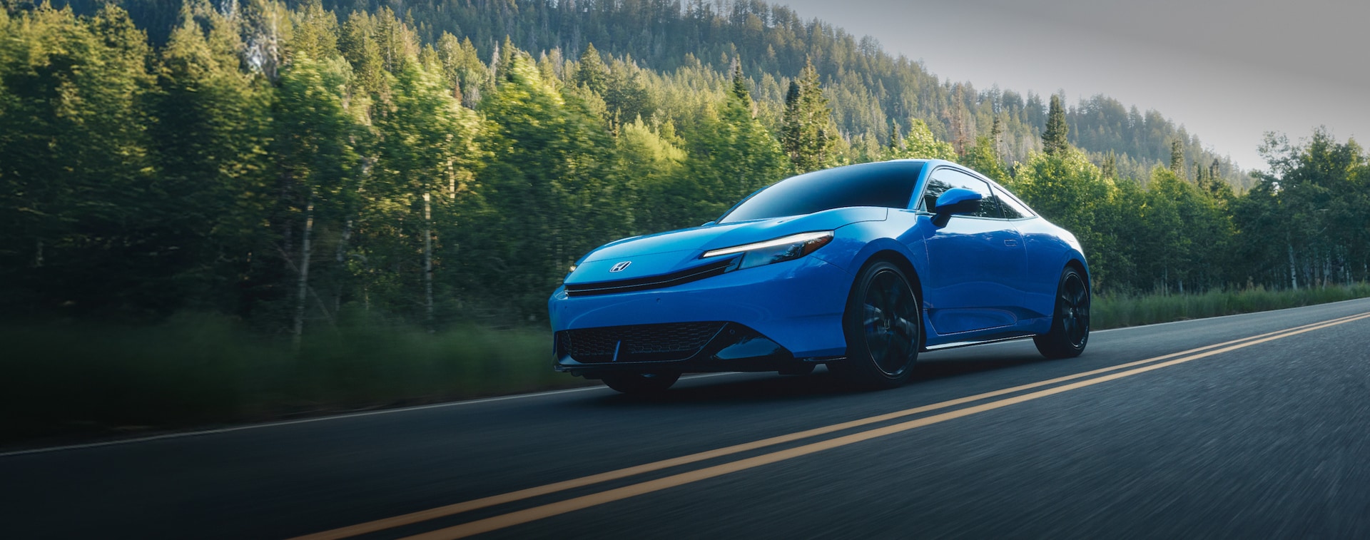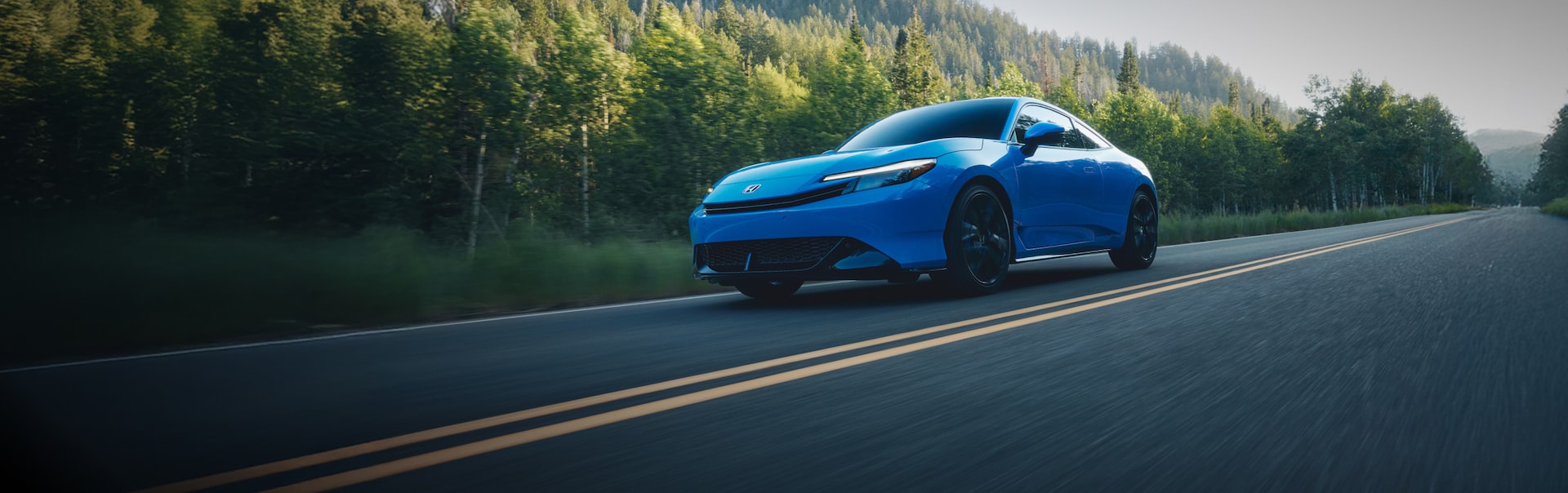 2026 Honda Prelude in Boost Blue Pearl driving trough a road with trees in the background.